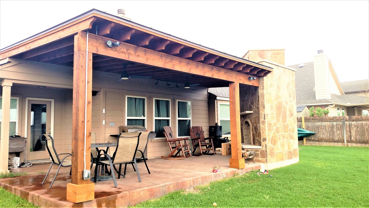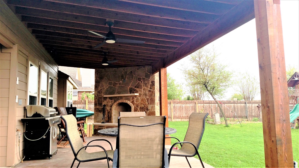 These homeowners in Pflugerville, TX, saw the potential in their backyard patio. They were happy with the size of this patio, about 10 feet deep, and the stained concrete finish. They wanted to add shade, the option to watch TV outdoors, and the magic of an outdoor fireplace. Archadeck of Austin was happy to provide everything necessary to bring the homeowners’ vision to life.