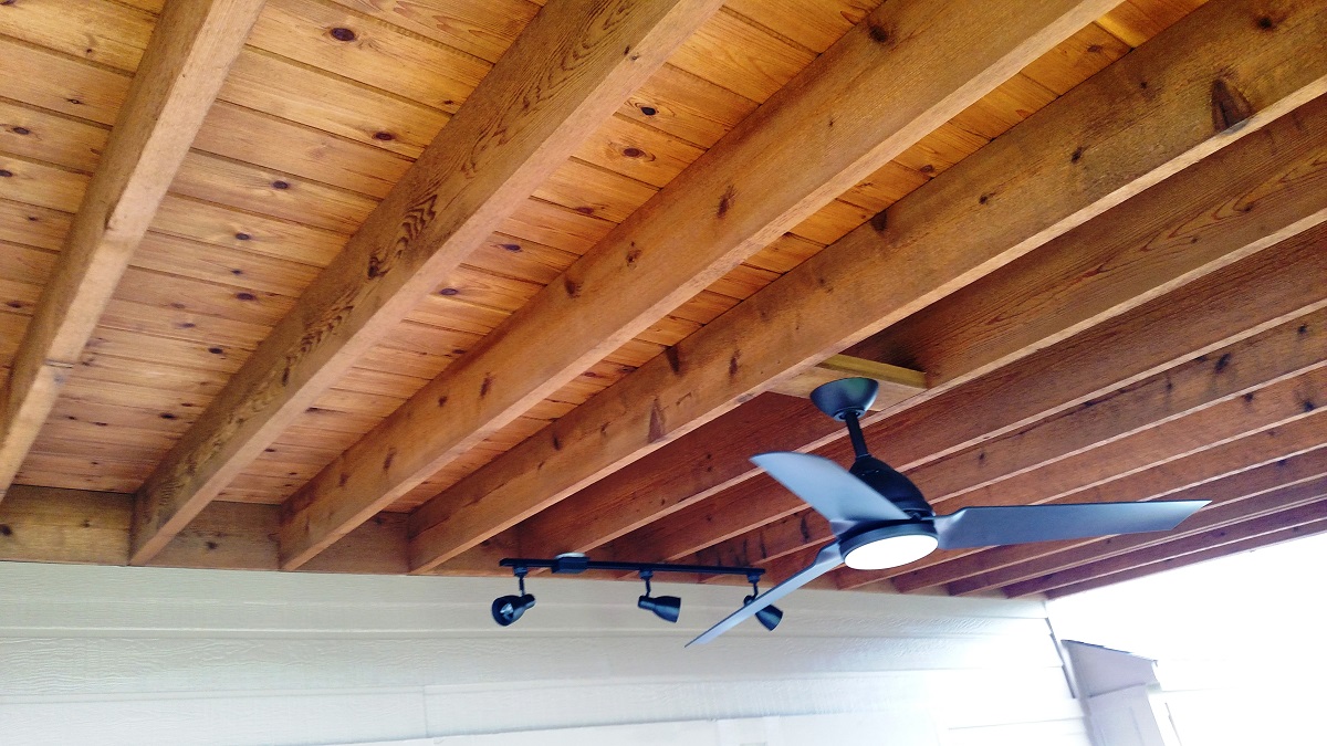 Finally, we added electrical with conduit so the homeowners could run wire directly from the attic for cable TV on the patio. With two ceiling fans, track lighting and exterior lights on the crossbeam, our clients have creature comforts to make this outdoor room a haven.