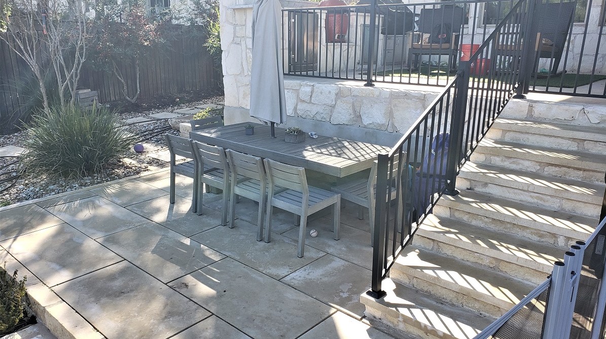 The railing our clients selected for the upper patio is a black Fortress iron railing with 2” posts. The railing also extends down the stairs that lead from the upper patio to the new patio below. We built the new stair risers with white limestone. For the steps we used the same smooth Lueders stone used for the patio surface.