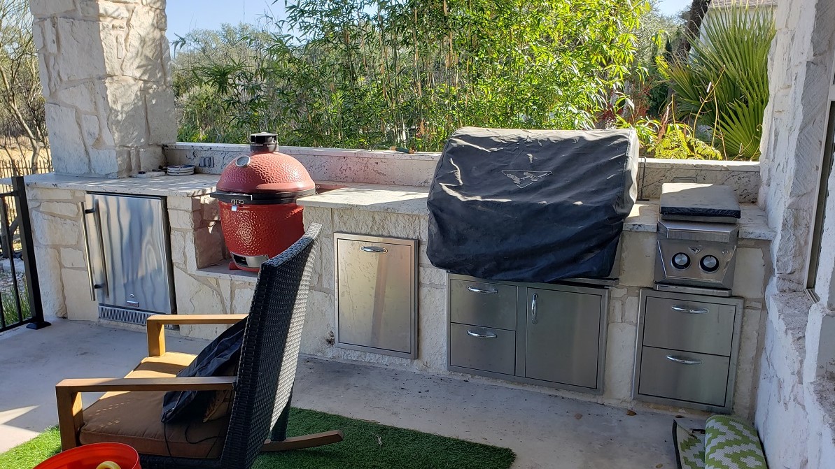 Our clients wanted to remove a wooden deck at the back of the home and replace it with a patio and outdoor kitchen. They already had a covered patio leading from the home to the deck. It was the perfect spot for a kitchen addition. The components we installed for the kitchen include a burner, storage drawers, garbage can holder, a Blaze refrigerator and a Kamado Joe smoker. We used white limestone for the kitchen stonework to match the columns and other stonework on the home’s exterior.