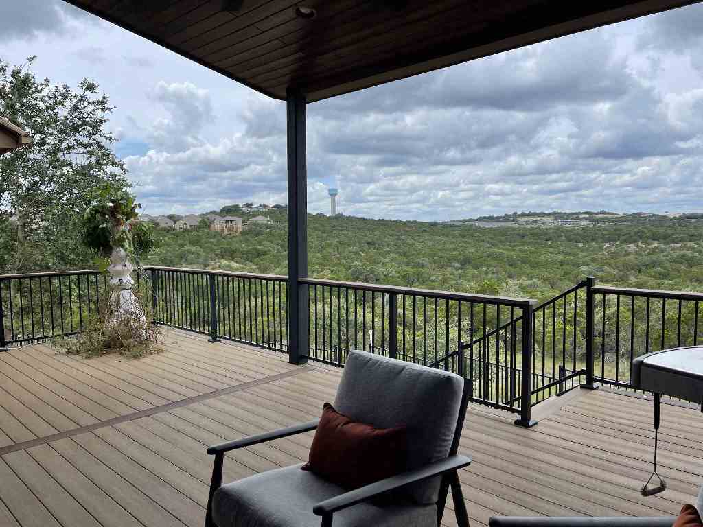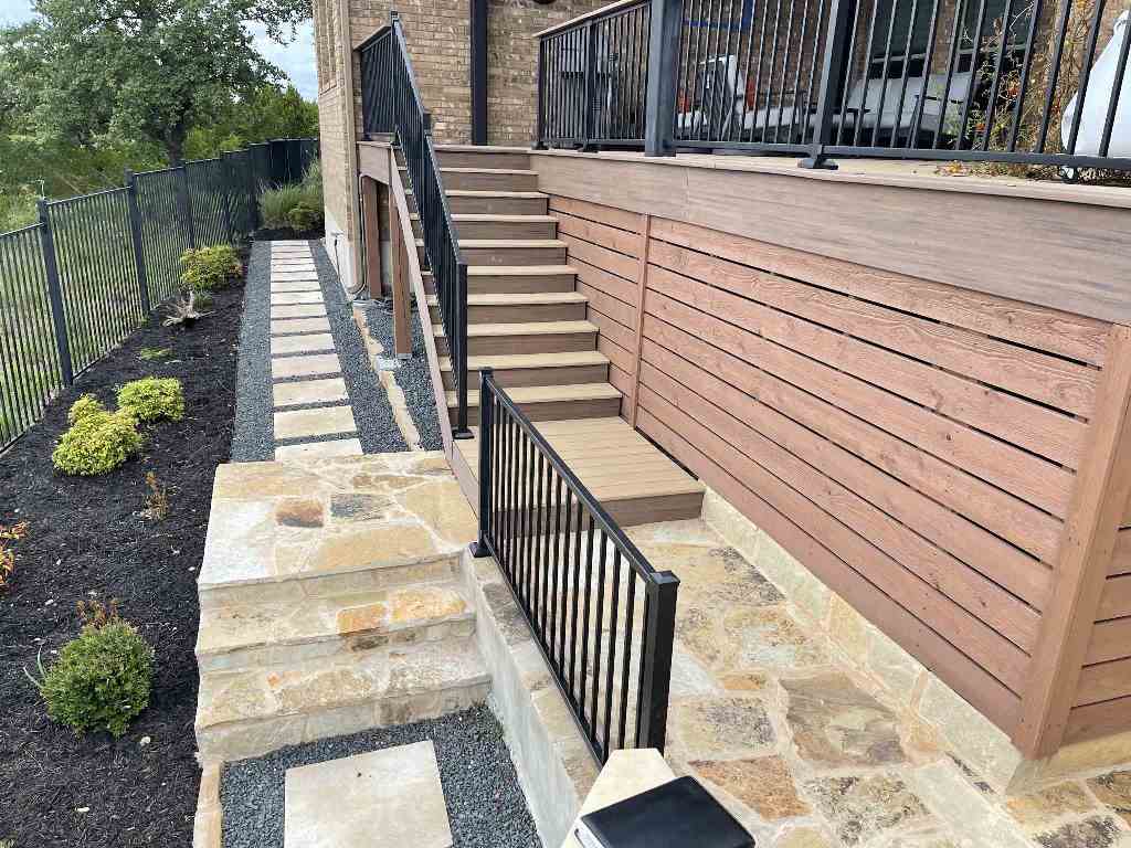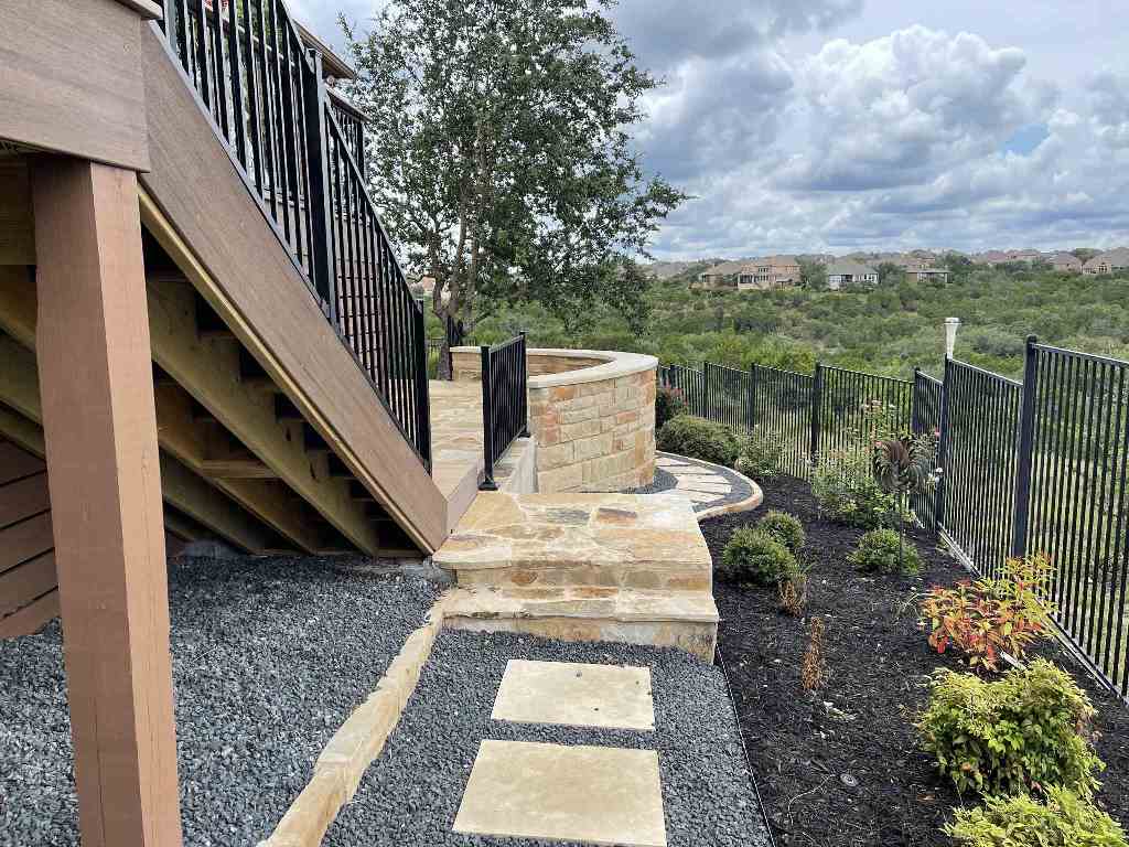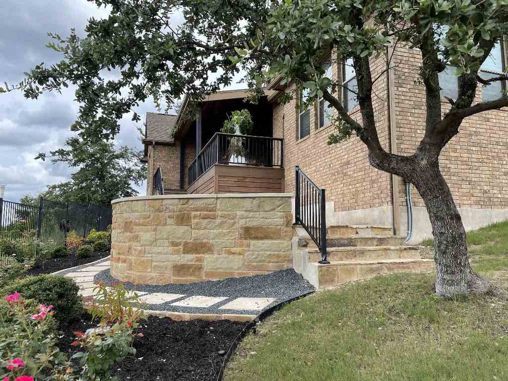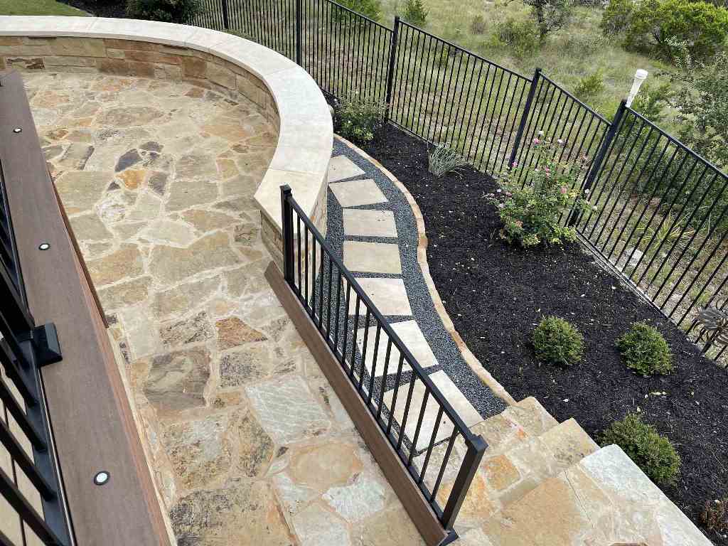 These homeowners in the Falconhead West neighborhood of Bee Cave, TX, started with a blank slate when planning their outdoor space. When we arrived, they had only a concrete slab off the back of their home with a landing and stairs to the ground. When we packed up our tools and drove away, they had a covered porch, elevated deck, flagstone landing and patio and a Lueders stone walkway. Their new outdoor space for relaxation was complete – except for the hot tub. At least now they have a dedicated patio space for that hot tub when it arrives.