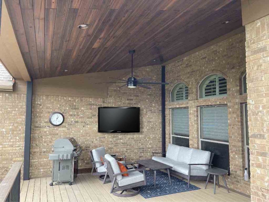 The clients can use their new covered porch and deck as one long, continuous space for entertaining. They can also use these areas as two separate outdoor rooms, one with a roof and one without. The advantage to this combination is that they will always have both a shaded area and an open area. Sometimes you need protection from the sun or rain, and sometimes you don’t! We built the porch ceiling with Synergy Wood, a prefinished, tongue-and-groove product that always looks amazing. A ceiling fan here in the porch guarantees a breeze.