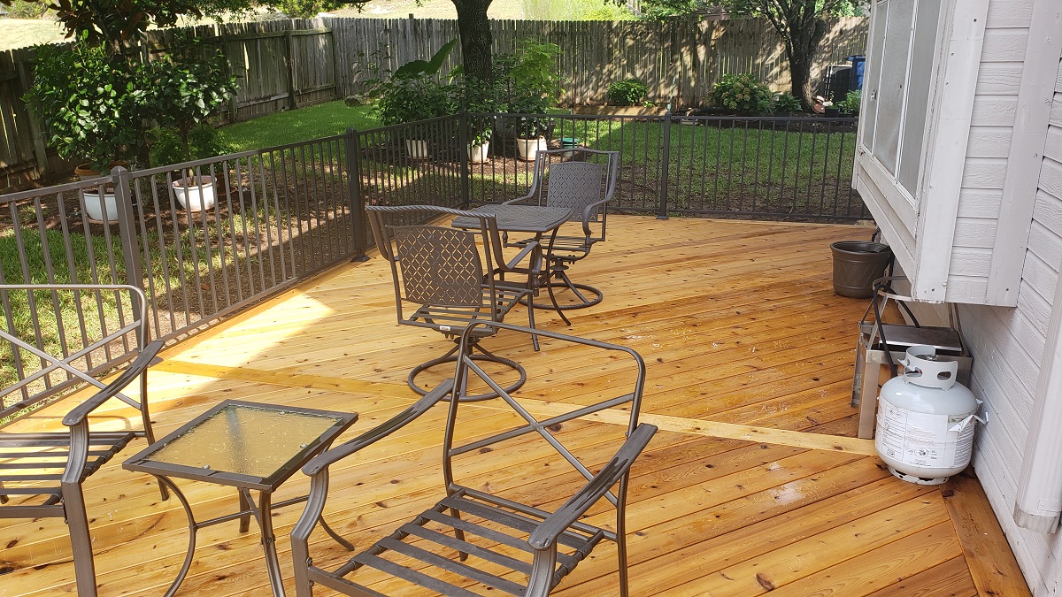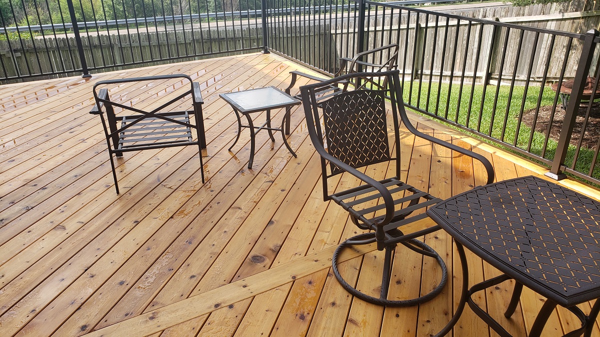 The cedar deck looks right at home in this setting, especially with the Sherwin Williams natural stain color the homeowners selected. The black iron railing, 36” tall, features 2” iron posts. The thin, black balusters in this railing seem to disappear into the view rather than obscure it.