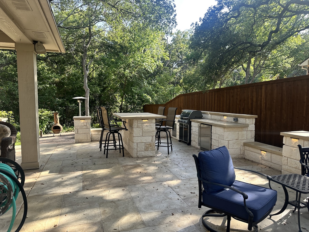 Surrounding the new outdoor kitchen design is a stoic assembly of large limestone blocks – with a Roman stone concrete overlay to be exact. Connecting stone seating benches with stone pedestals were integrated into the revitalized area as well, so family and guests could be more comfortable when conversing with the chef of the household.