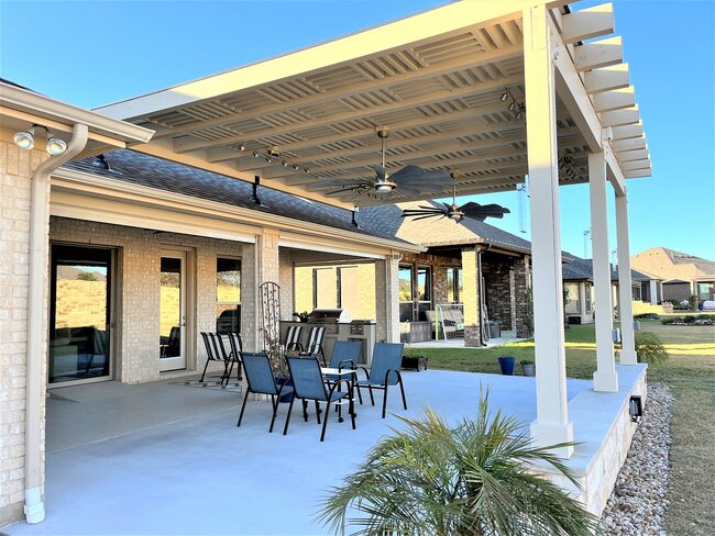 Starting at the base of the newly designed pergola shade structure in the Vizcaya neighborhood of Round Rock, you’ll find a beautiful blend of softly colored chopped block to augment the hues of the home’s brick exterior.