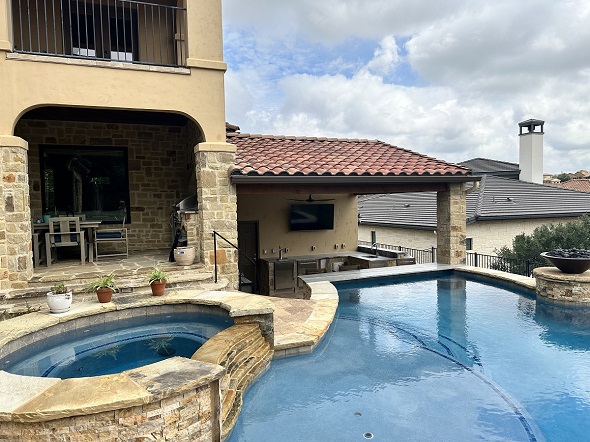 The pool company installed the Travertine floors but our Archadeck Lakeway team built everything else – the electrical work, the heating system, the new outdoor kitchen, the stucco walls – everything that was needed to complete this leisurely oasis.