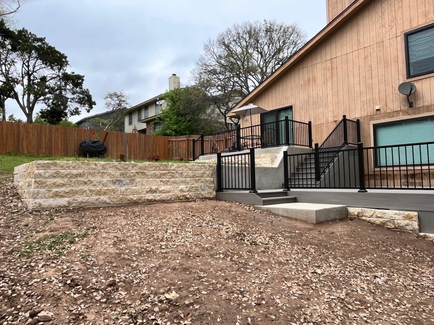 Replacing a backyard deck that had seen better days was a delight for our expert deck building NW Austin team. With WUI compliance and long term durability in mind, this backyard deck foundation is all stone – White Limestone, in fact, with touches of Nicotine.