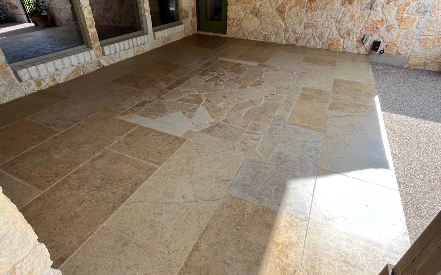 Our team used 2 by 4 Lueders Stone in Mountain Brown. At the very center, we custom crafted a rectangular broken mosaic installation for heightened visual interest – a beautiful aesthetic complement.