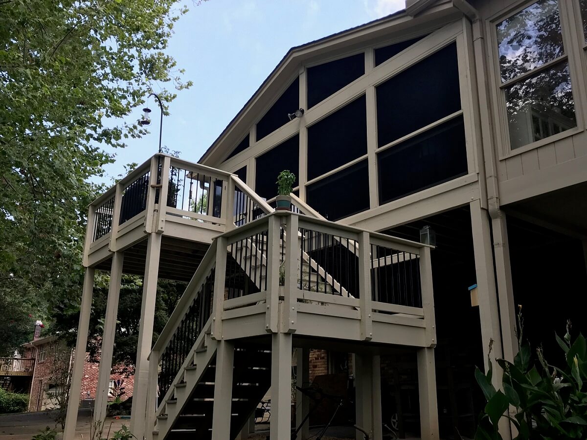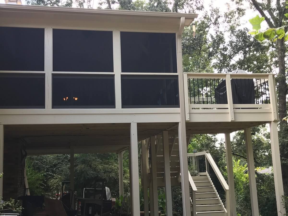 Today’s featured project in Mountain Brook, AL, is a beautiful screened porch we built for two cats and their human family. The porch is built with pressure-treated pine, and the black aluminum balusters are made by Deckorators. Notice the railing and balusters inside the porch screens. Some homeowners would have used a knee wall here, but these humans wanted to give their cats floor-to-ceiling views of the outdoors.