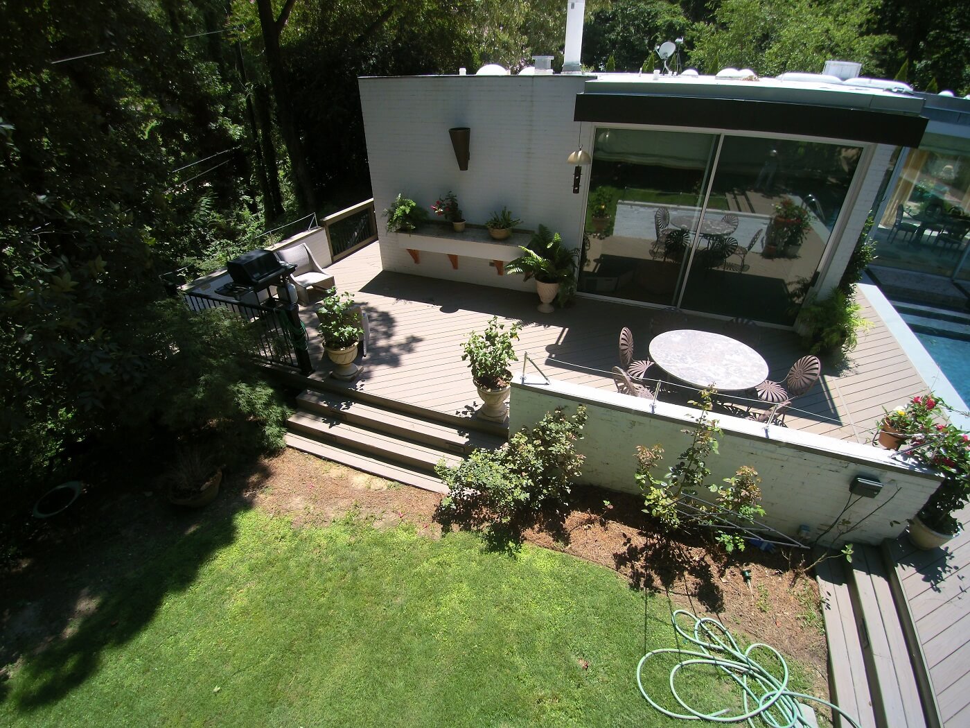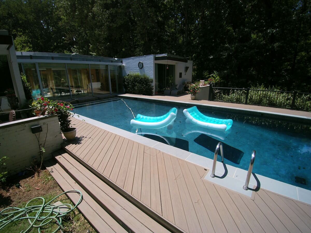 The pool is an inground above ground pool, sometimes called a semi-inground pool, made with beautiful Italian tile. We built a free-standing deck around the pool and extended the deck opposite the house to create a lounge area under a large pergola. Archadeck of Birmingham built the deck with pressure-treated pine and the pergola with cedar. The railing, which extends the length of the deck and the pergola, is all aluminum.