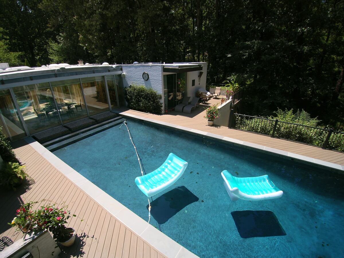 First, you have to love a home that has an outdoor living space designed so that you can step through your glass doors directly onto your pool deck. How convenient! In this case, the pool deck meets the home’s back doors (in the center section) on both sides of the pool.