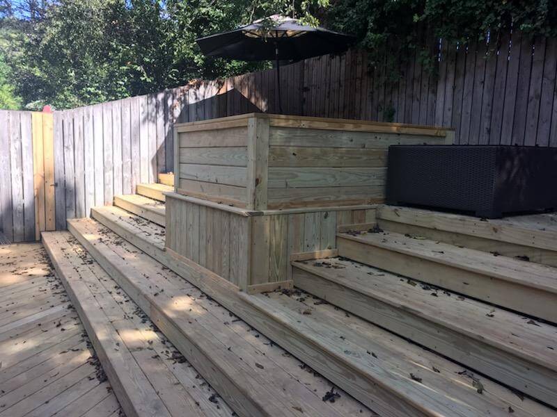 — New wooden condominium deck in Homewood with an innovative custom planter box.