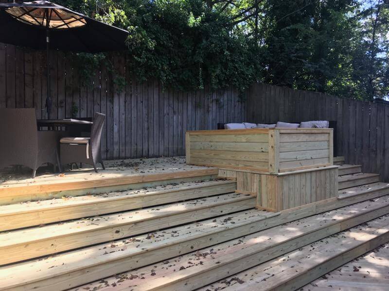 Their original pressure-treated wood deck had reached the end of its useful life, so a completely new deck was in order. Meanwhile, their tree that had been growing up through the original deck had been removed, leaving a stump. They wanted the new deck design to include a way to hide that stump.
