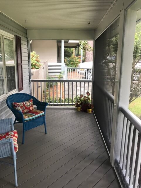 The custom design Archadeck came up with addressed all of the client’s needs, desires, and budget! First, we installed a sleeper system over the existing front porch in order to accommodate the new structure. We then installed new walls, new 6 × 6 wall posts, flooring and railing. TimberTech Terrain low-maintenance decking was used on the floor of the new porch and the bench steps we added out front. For the railing, we installed TimberTech Radiance Rail in white to add a clean contrast to the gray tone of the porch flooring. The entire area was then screened using the SCREENEZE® system which we mounted from the inside so as to not take attention away from the beauty of the porch posts.