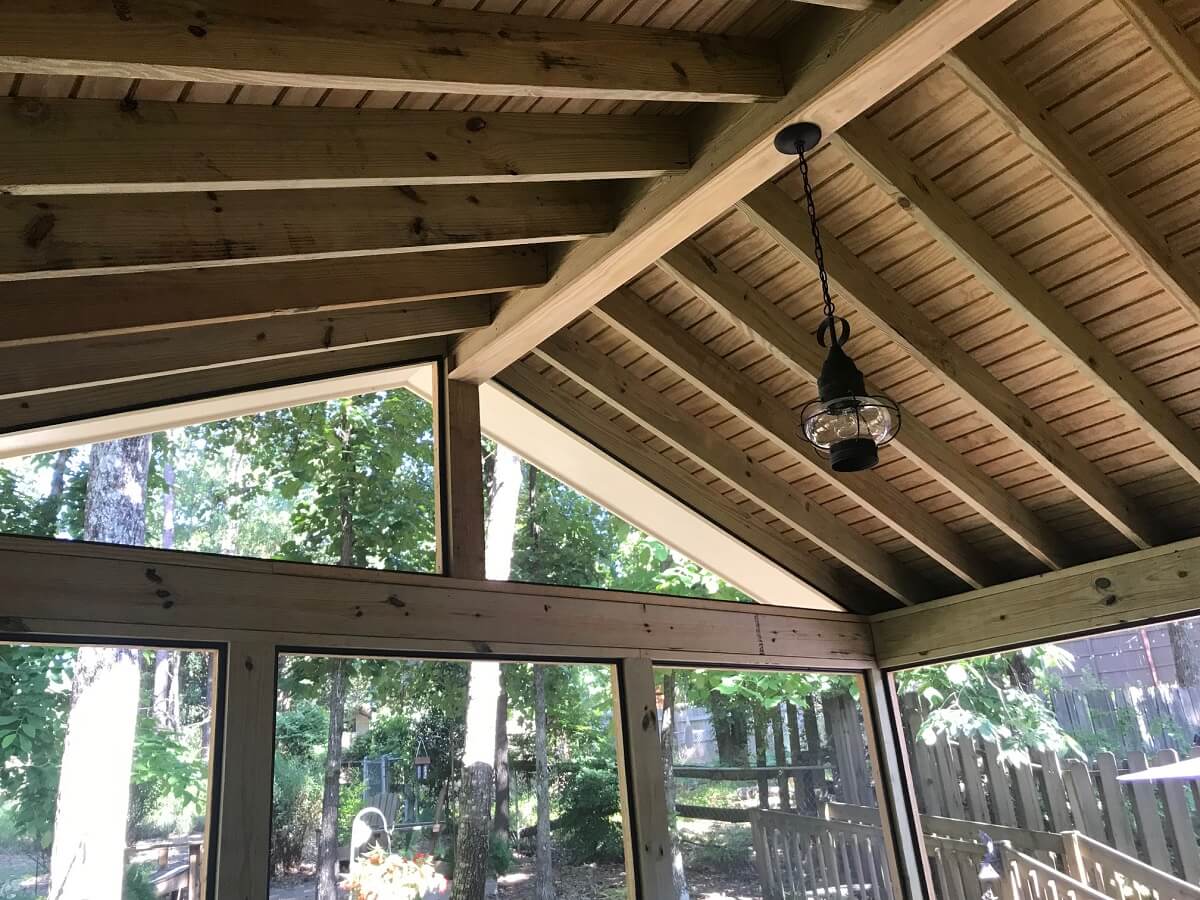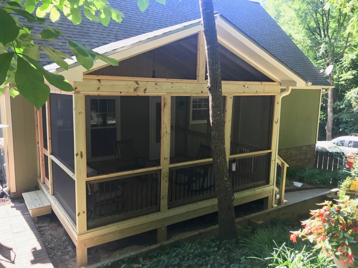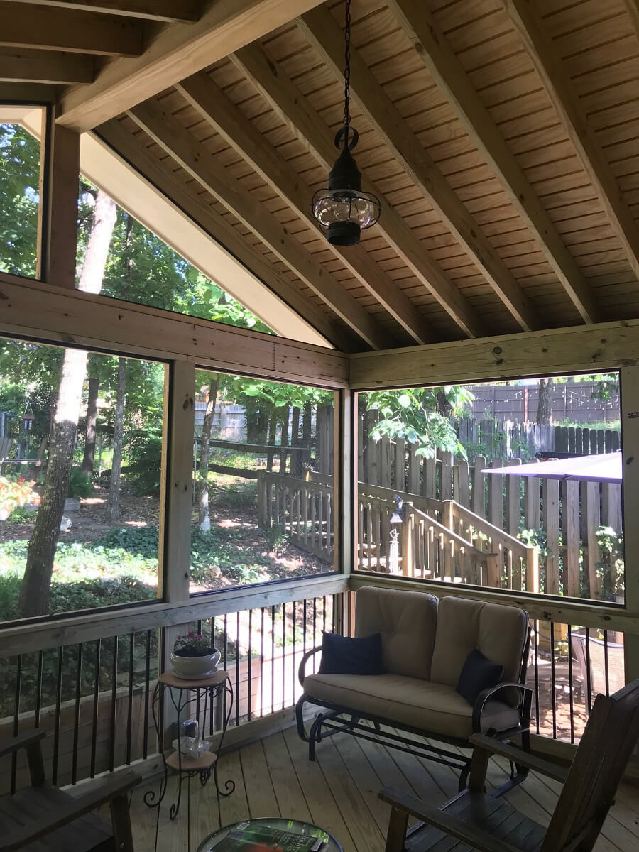 We designed the porch with an open gable roof for extra height and greater expanse of the screened area. This summer, the family will appreciate the additional airflow the open gable roof facilitates. The porch roof matches the home’s existing roof, also a gable design. As your Alabaster, AL, screened porch builder, Archadeck of Birmingham custom-designs each porch to blend in and look original to the home rather than added on.