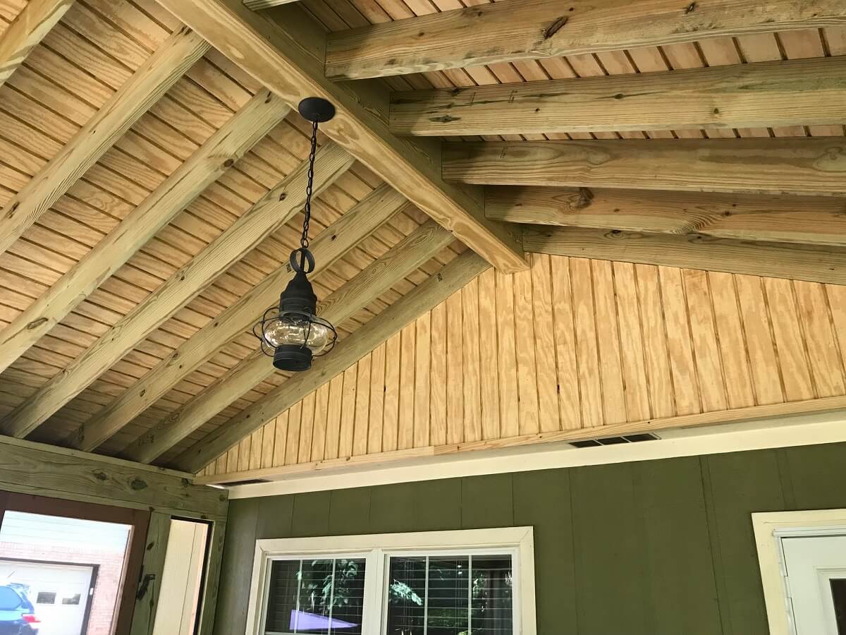 The aesthetics of pressure-treated pine throughout this screened porch are anything but boring. From the diagonal orientation of the floorboards to the exposed rafters, the porch delivers a thoroughly rustic vibe. We used PT pine for the rafters, wall posts, and rails in addition to the flooring.