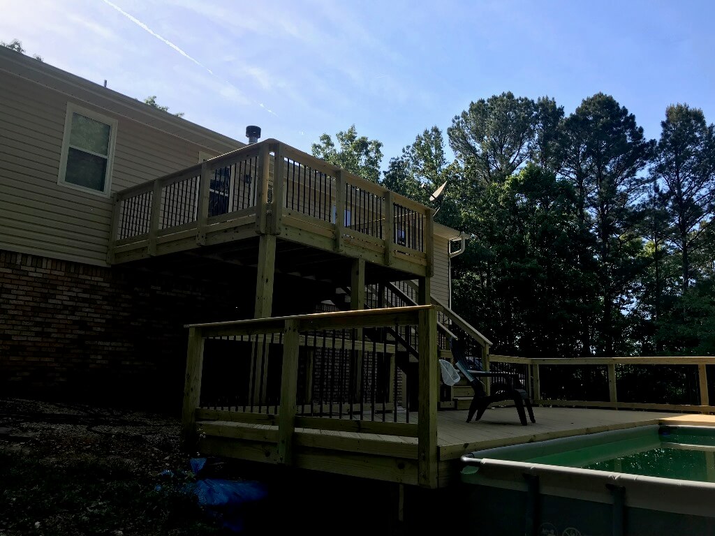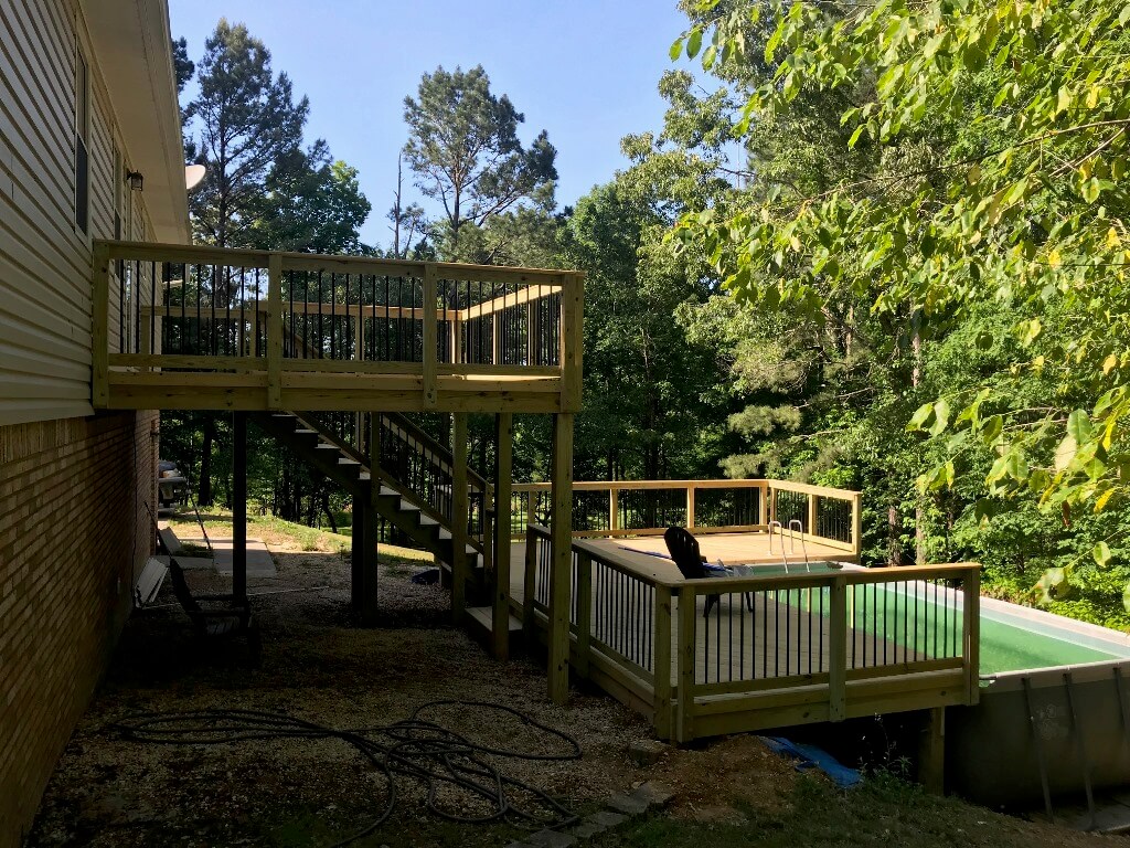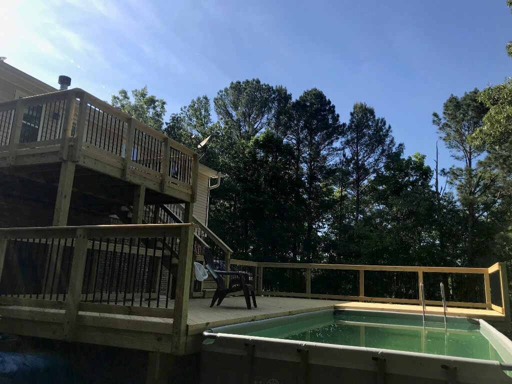 Deck designer and builder Archadeck of Birmingham created a new two-level deck that includes an elevated area as well as a pool deck. The spacious poolside deck provides plenty of room for lounge chairs around the pool and access directly from the deck to the water.