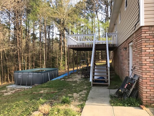 The first thing you might notice about this back yard is the steep slope of the lot. As you walk away from the house, the yard drops off quickly. The family had a small deck overlooking their above-ground pool, but they didn’t have a way to access the pool directly from the deck. It almost looks as though the deck was teasing them!