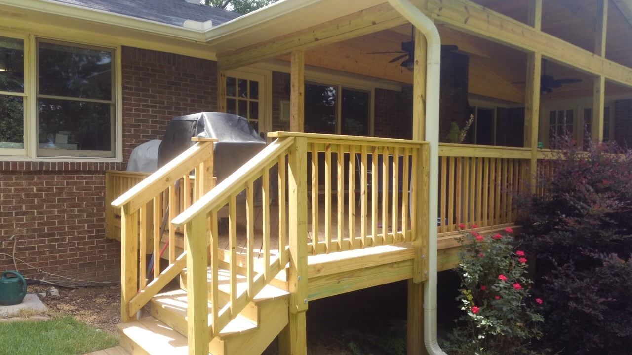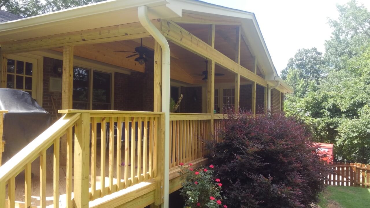 The new spacious open porch in constructed of all pressure-treated pine. It features a gable roof with a beautiful knotty pine V-joint interior ceiling. In addition to the porch addition, Archadeck of Birmingham also built the homeowners a small grill deck just off the porch. The deck adds tons of potential for outdoor dinner parties and cookouts for the family!