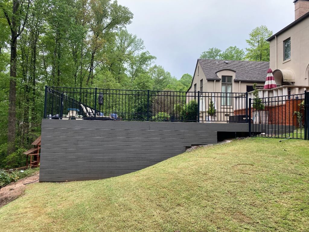 Archadeck of Birmingham removed the old pool deck and began building a new one from the ground up! Using this approach allowed us to ensure the substructure of the pool deck was up to code and structurally sound. The homeowners chose lovely TimberTech low maintenance decking from the ProTerrain collection in silver maple. This decking capped on all four sides all the way down into the grooves. The capping is made with 100% synthetic materials for total immunity against moisture, making it the perfect choice for a poolside oasis! With an easy to clean surface and color engineered to stay looking new, this decking also comes with a 30-Year Fade & Stain warranty.