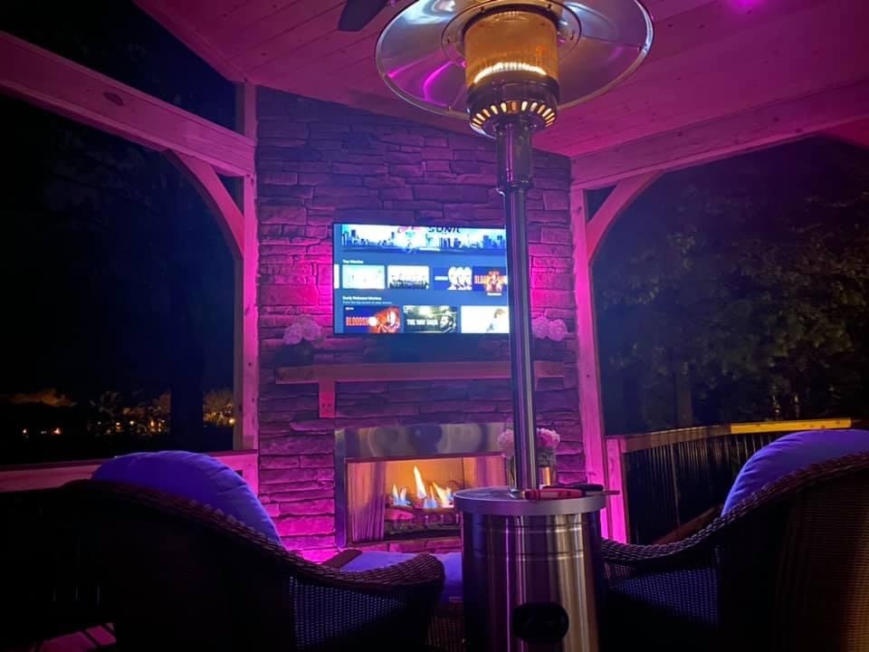 On a stacked faux stone wall, the clients placed a large format outdoor living TV above a vintage mantel. The mantel served as the crowning touch above the custom gas fireplace we designed, a true thing of beauty crackling against the midnight sky.