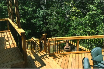 Some homeowners elect to use low-maintenance composite decking for their redecking project. These clients, however, prefer the look of natural wood. Given the heavily-wooded area this deck overlooks, you can see why! So they replaced an older wooden deck surface with a fresh, new surface of pressure-treated wood. With proper care, it should look great for another 15 years. Redecking usually includes replacing a deck’s railing and stairs as well as the deck surface. The homeowners selected wood railings and powder-coated aluminum balusters. We love these thin, black balusters because they don’t obscure the view from the deck.