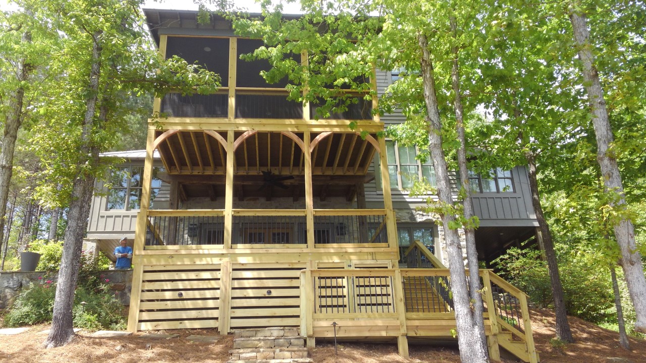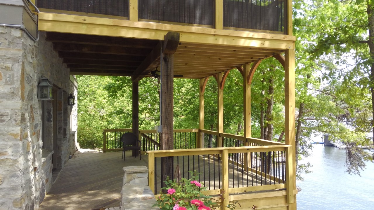For starters, this Birmingham porch builder took the existing lower lever deck and upper porch, and expanded it from eight feet in depth to sixteen feet, gracing the water’s edge.