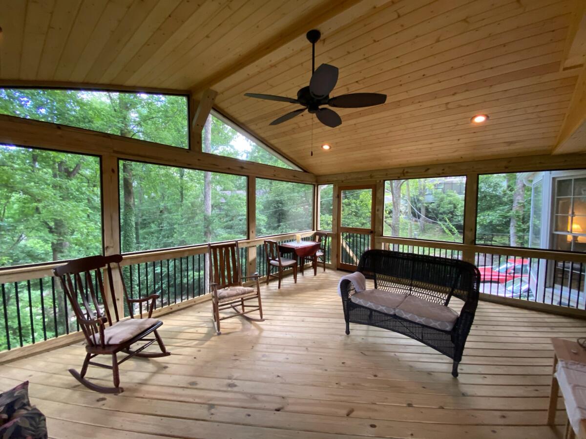 In addition to screening in this new porch, we finished it with a pressure treated premium wood floor, interior upward views reveal a beautifully appointed v-joint grooved ceiling, made complete for evening enjoyment with recessed can lighting and a ceiling fan.