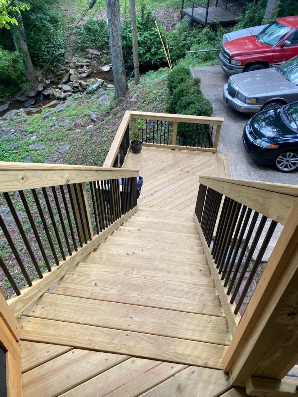 As for materials, it was decided to use beautiful and durable pressure treated wood for the deck and adjoining staircase, complimented with a pressure treated rail. This allows for a beautifully streamlined design,