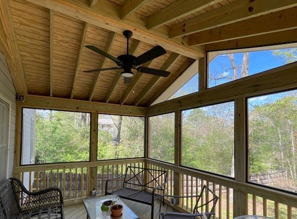 Just off the new deck, this Birmingham custom deck builder constructed a generously-size screened covered porch with stunning exposed wood rafters giving the new outdoor room great height, and accommodating a wide triangular transom window at the porch’s peak.