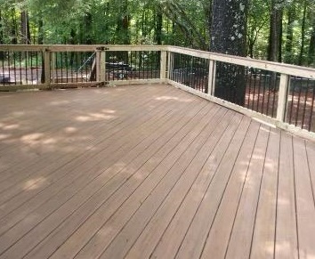 Speaking of ensuring safety, this Birmingham area deck expert enclosed the entire new deck with our standard rail, which is a pressure-treated wooden rail with aluminum balusters and a matching composite rail cap.