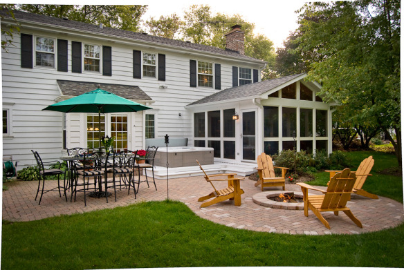 Check out this project to see how multiple outdoor areas can be combined to give a cozy and relaxing feel to your backyard. The project features a screened porch, a stone patio, and a fire pit, fully decorated with an outdoor dining area and spa.