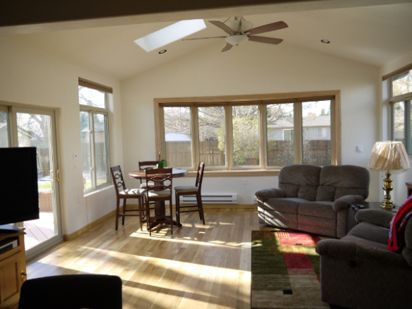 The decks included Timbertek Reliaboard decking with floating benches. They used Colorado custom window builders Accent Windows. The sunroom also included skylights by VELUX.