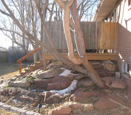 One of the unique features of the rock landscaping was the way the existing trees were integrated into that landscaping integrating nature and living space. You can see from this picture that by keeping the existing trees, they added to the uniqueness of the structure while providing wonderful shading for the deck.