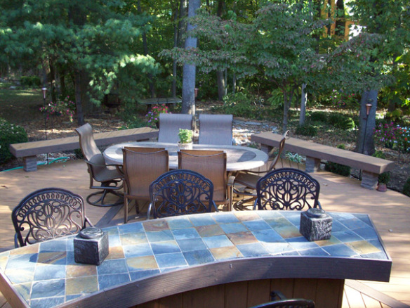 The deck you see above is located in Centerville Ohio. One of the nice things the owners did is asked for a rounded bar on the deck to further the rounded theme. Their backyard was already meticulously professionally landscaped using all spheres or what landscapers call a curvilinear design.