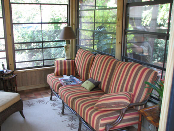 Although the screen porch is detached from the house, the homeowner sometimes enjoys sleeping there at night.