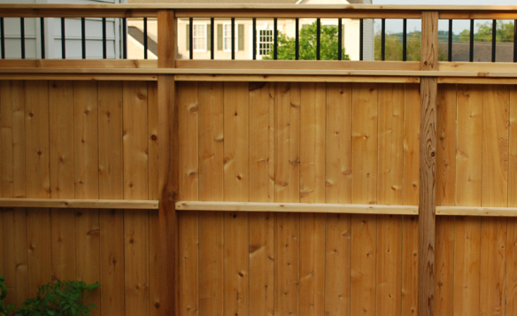 Cedar privacy fence in solid board style with aluminum balusters incorporated to match the deck railing that was already there.