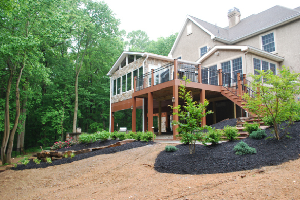 When Juan Cardona and the design team at Archadeck of Chester County met with these homeowners in Kennett Square, PA, which is known as the mushroom capital of the world, to create this masterpiece in outdoor design, they had an existing deck that was in dire need of replacing as well as an open deck at the rear of the home with an unsightly concrete slab patio under the deck. The homeowners wish was to create an outdoor area that incorporated a sunroom, less deck and a patio on the lower level. They also wanted to include a built-in cooking area, spa area, and a custom fireplace or fire pit to accommodate their desire to have room and suitable entertaining areas for larger gatherings down below as opposed to having an all-open deck on the second level. The obstacle that had to be overcome was the fact that their yard was on a rather severe slope. In order to deliver the outdoor oasis the homeowners desired, we would have to install some retaining walls to make it happen.