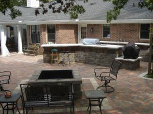 Talk about a multi-purpose space! This project from our patio contractor in Macon has it all! The custom outdoor kitchen has a large eat in bar to sit or stand at while cooking and the fire pit is clearly defined with a different colored paver. The large patio surrounds a pool where everyone can sit and relax.
