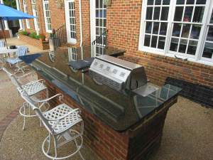 The brick base of this L-shaped outdoor kitchen complements the brick finish of the home perfectly. It has granite countertops for easy clean up and a built-in grill and warmer.