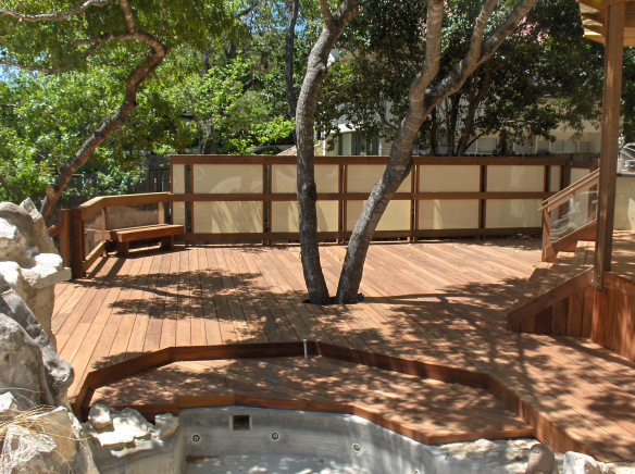At Archadeck Outdoor Living, our custom designs often incorporate the natural features of the property since many of our clients want to keep the outdoor elements in their outdoor spaces? One of the most common issues/design concerns are existing trees. While some homeowners may be OK with removing a few trees for an enhanced deck or patio design, others like to include the trees in their space. In these two examples, you can see that the deck is built around the trees. Here the decking is close enough to the trunks of the trees where additional railing isn’t needed, but sometimes it is necessary for added safety. Both of these projects remind me of tree houses, which I love.
