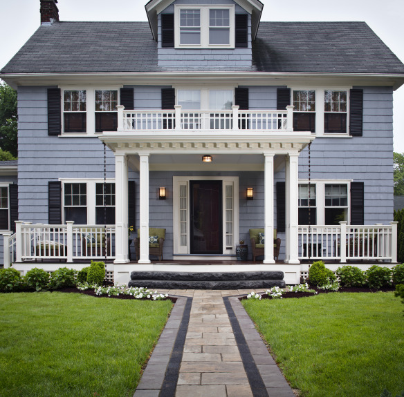 I love the front walkway to this home because it isn’t cookie cutter. It’s special. The three colors are the perfect complement to the rest of the front facade. The dark lines bring out bring out the black shutters and door, but it would be way too dark for the entire walkway.
