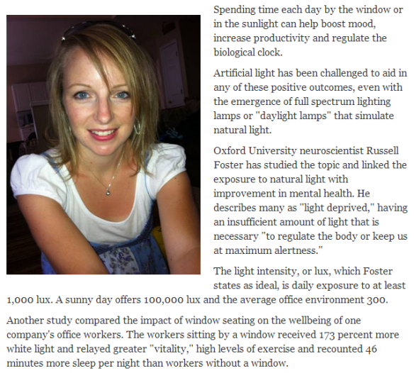 The same study explores the effects of sunlight on office employees. Apparently, workers seated next to windows reportedly had greater vitality and were capable of performing higher levels of exercise. They also enjoyed 46 minutes more of sleep per night than those seated away from office windows. To offset inadequate sunlight exposure indoors due to low lux levels, Foster recommends spending time outside in the sunlight for about 30 minutes each morning.