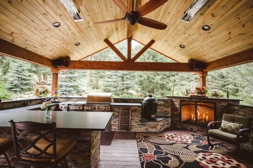 To ensure that the space could be used most of the ear, the Colorado weather needed to be addressed. Sometimes it’s hot, sometimes it’s cold and sometimes, it’s just right. For the warm months, the covered porch will provide some reprieve from the heat by providing shade, but even then it could be warm, so a large ceiling fan was mounted in the middle of the porch to provide some air flow. For the cooler months, two additions were strategically added to the design. As you can see there is a beautiful outdoor fireplace in the corner. It’s a focal point of the entire porch, but we weren’t sure it would be enough to keep people outdoors. In addition to the fire feature, two heaters were installed in the ceiling as well, heating the area below and instantly increasing its function.