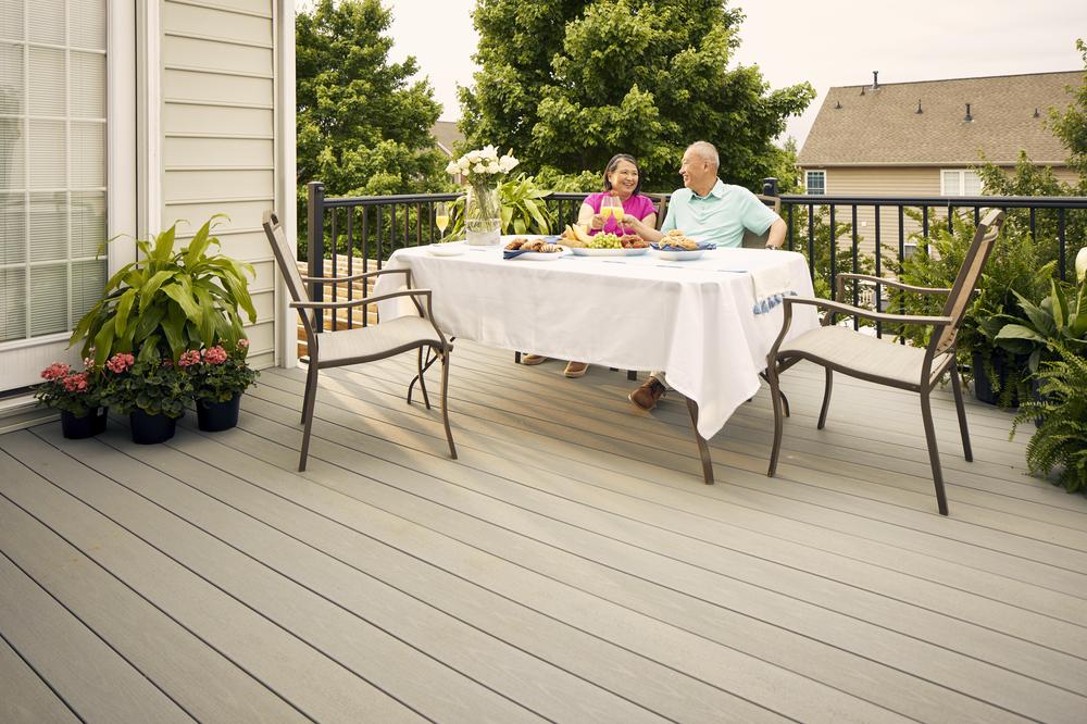 Composite decking outperforms wood — hands down. It doesn’t fade in the sun, won’t stain from things like mildew or leaves, is more scratch- and pest-resistant, and it won’t rot or warp with sun or harsh weather exposure. It’s also treated to resist mold and mildew, which keeps your deck cleaner and helps it last longer.