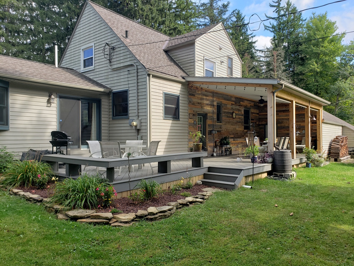 Rustic attention to detail is the appeal for this covered porch and deck combination, from multi-color wood walls to the matching rain barrel. This porch and deck combo was carefully designed to appear original to the home. Composite decking extends beneath the covered porch area and open deck space for visual continuity. The deck’s railing creates additional seating while serving double duty as a safety feature and interesting design element.