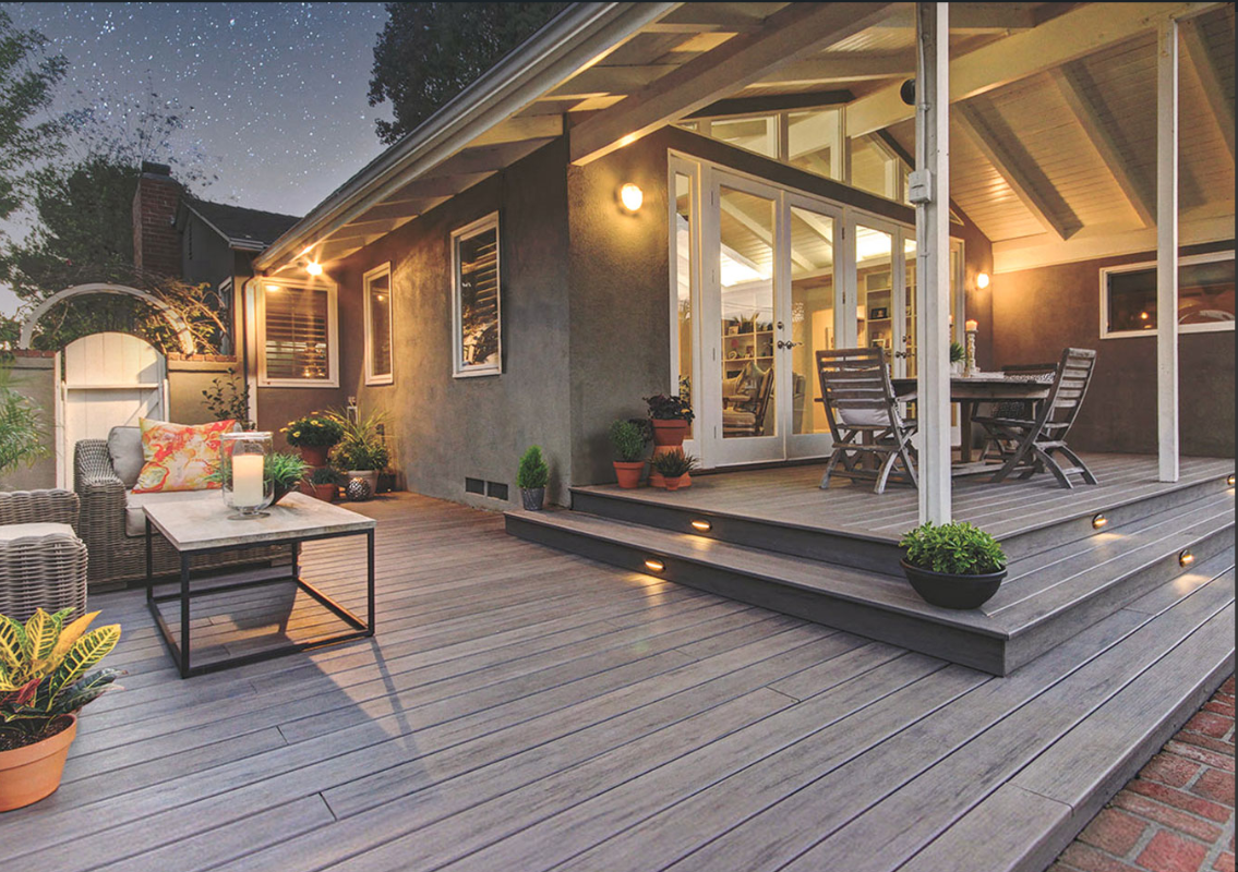 • Very low maintenance composite and PVC decks with integrated lighting and sturdy railings