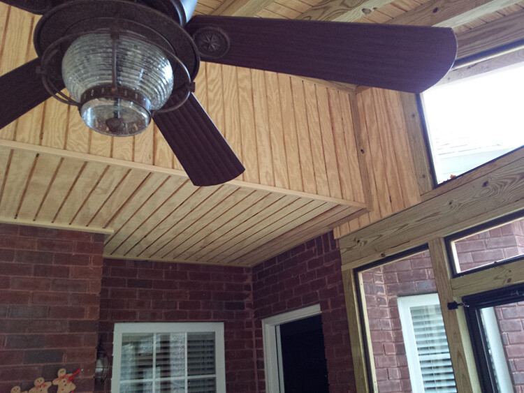 As we continued with the design process, the next consideration was how to best connect a porch to their home. The back of this brick home had a bayed window right next to where the porch would connect. It also had a low house roof requiring a roof connection. We were able to connect the roof right next to the bayed window but made sure to take some extra considerations for rain. As you can see in the picture above, rain runs down the side of the bayed window roof. We added additional flashing and enclosed a small area of the shed roof to protect the porch from streaming or splashing water in the rain. Take a look at the picture below to see how this enclosed porch roof section fits perfectly with the beadboard style ceiling in the porch interior.