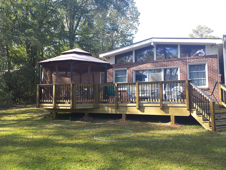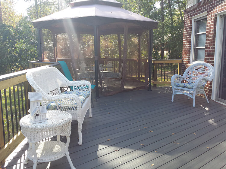 When these homeowners in Providence in Macon GA called us, they had a couple very specific objectives. They had a carport that they were forcing to double as a home for both their cars and their porch chairs. They wanted a permanent spot for their porch chairs and to dedicate their carport exclusively to their cars. Their second objective was to utilize a hexagon-shaped patio cover they had purchased. They knew they wanted a deck and they also knew they did not want to do any regular maintenance such as sanding, power washing or staining.