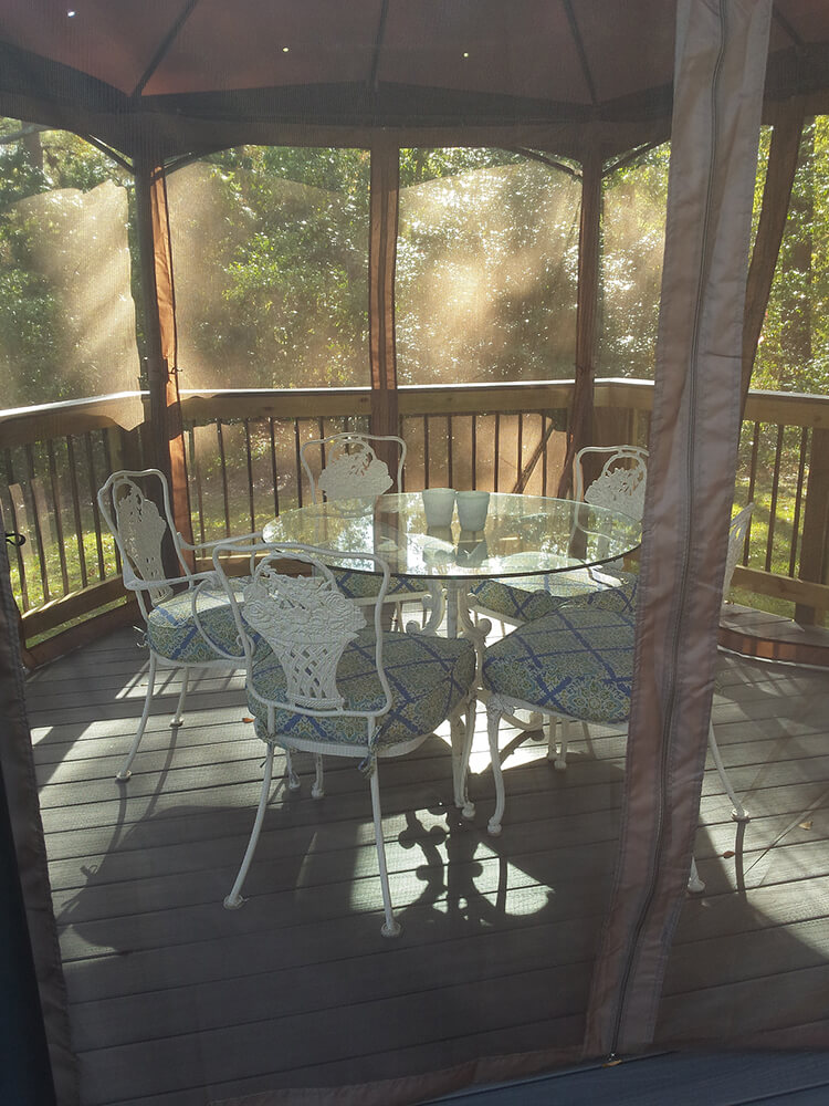 Above you can see the hexagonal section of the deck and how well the custom deck and free standing cover work together. The synthetic Fiberon decking is as durable as it is attractive. To ensure bug protection, we put a screen below the deck boards to keep any crawling bugs at bay.